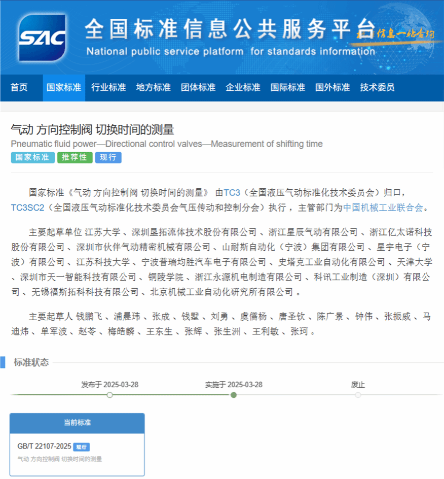 钱鹏飞教授团队牵头制修订的国家标准《气动方向控制阀切换时间的...