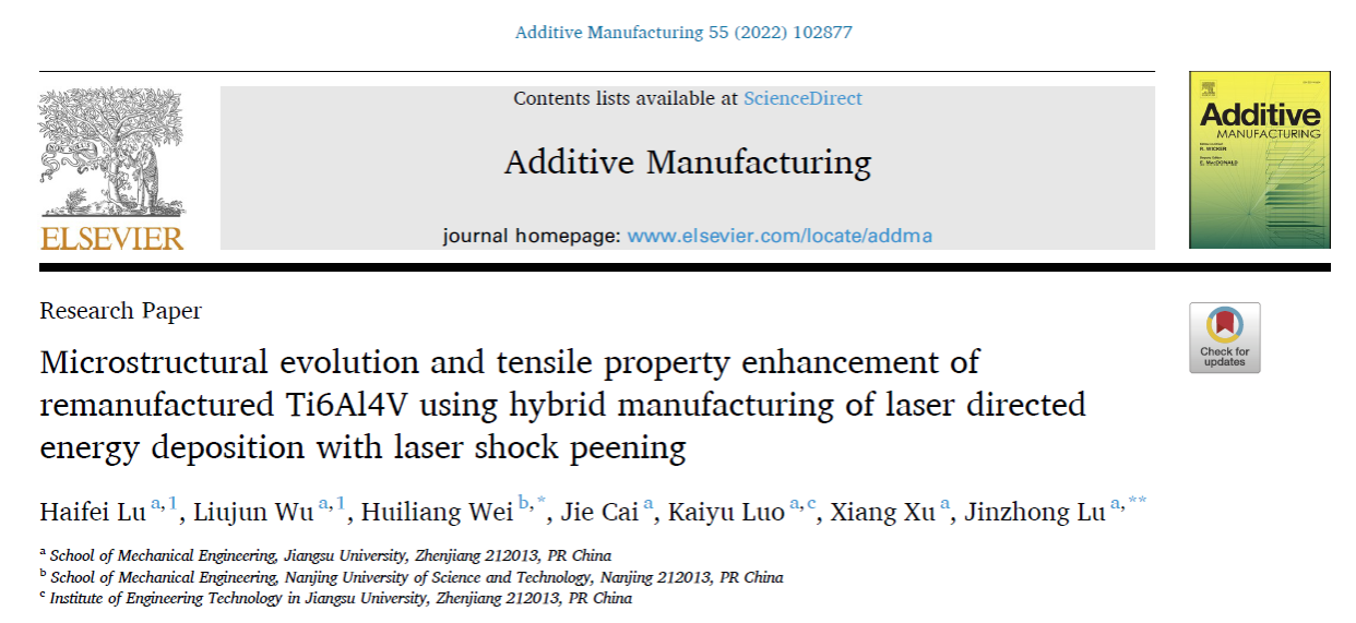 近日,经初评推荐、资格审查、专业评审、综合评审等程序,德赢Vwin官方区域合作伙伴鲁金忠教授团队发表在《Additive Manufacturing》期刊(IF=10.3)上的SCI高被引论文“Microstructural evolution and tensile property enhancement of remanufactured Ti6Al4V using hybrid manufacturing of laser directed energy deposition with laser shock peening(激光热力交互沉积再制造Ti6Al4V合金微观组织演变和拉伸性能强化)”成功入选2024年江苏省自然科学百篇优秀学术成果论文推选(德赢Vwin官方区域合作伙伴唯一入选)。青年教师卢海飞副教授为第一作者,鲁金忠教授和南京理工大学韦辉亮教授为共同通讯作者。该工作得到国家自然科学基金(51775250)等资助。