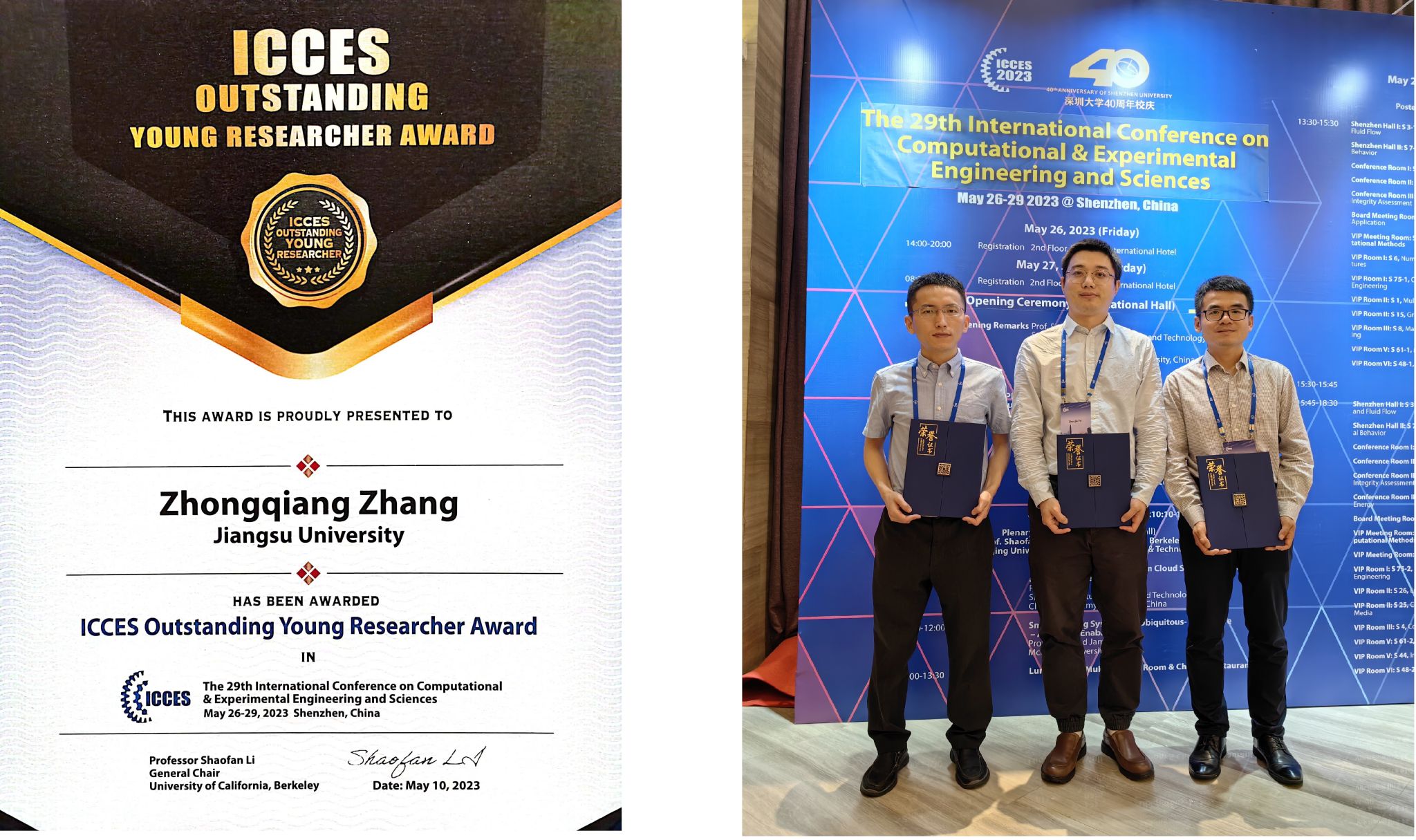 2023526-29日,第二十九届计算与实验科学工程国际会议ICCES2023在广东深圳成功举行。机械学院张忠强教授应邀组织了微纳流动与流固界面分会场(S61Mechanics in Micro nano Fluidics and Fluid-Solid Interfaces),并出席了颁奖晚宴。本次会议经计算与实验科学工程国际会议委员会推举、评选,德赢Vwin官方区域合作伙伴张忠强教授、上海交大张律文教授、南京航空航天大学殷俊教授、华中科技大学肖蜜教授、河海大学傅卓佳教授5位青年学者共同荣获“ICCES杰出青年学者奖”(ICCES Outstanding Young Researcher Award),哈尔滨工程大学张阿漫教授为五位获奖者颁奖。
