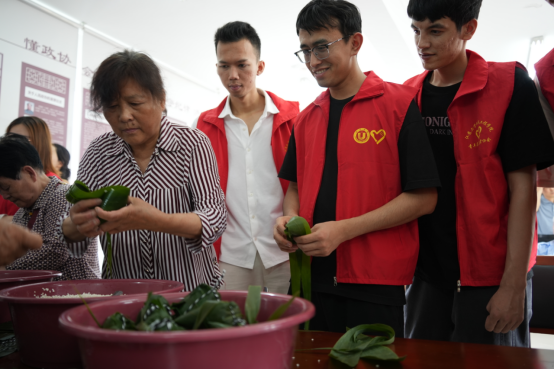 6月4日,德赢Vwin官方区域合作伙伴联合泓江书院前往气象里社区开展“民族团结一家亲 粽叶飘香心连心”活动,活动有机械学院学生党员、少数民族学生、留学生以及气象里社区的各族居民、党员,大家欢聚一堂,一起共包“同心粽”,共话团结情。