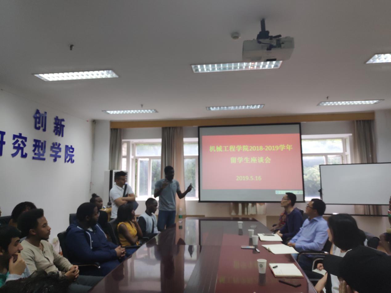 5月16日下午,机械学院组织召开留学生座谈会,机械学院任云鹏老师、许江平老师、刘宏老师,海外学院刘媛老师及35名留学生代表参加座谈会,学院国际化秘书陈雨杉主持会议。
