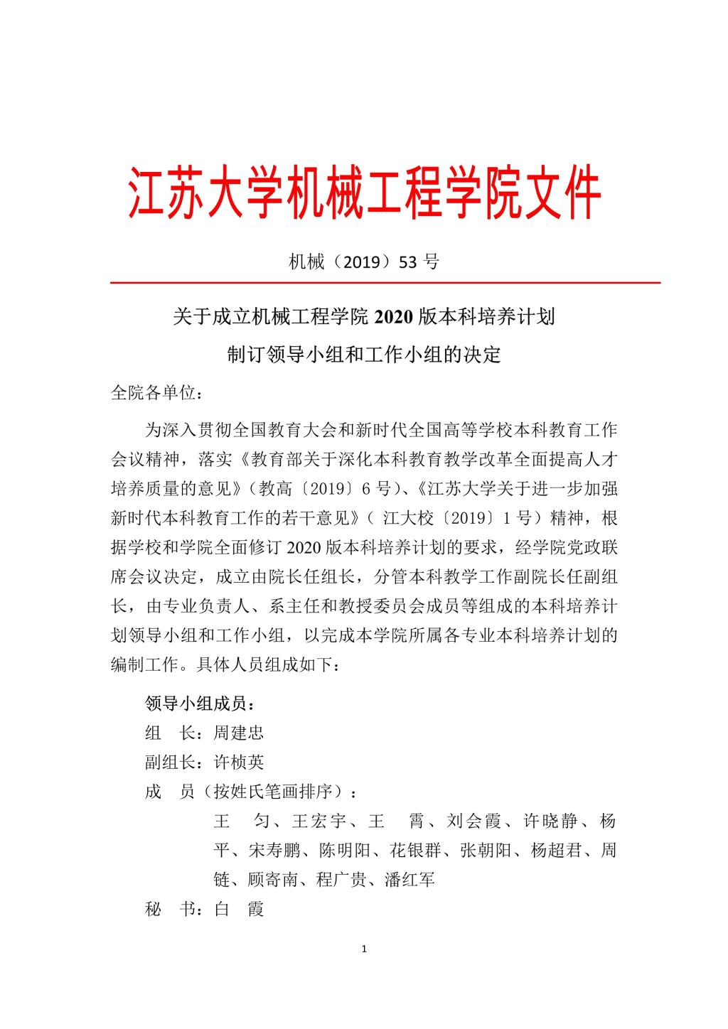 【机械〔2019〕53号】关于成立德赢Vwin官方区域合作伙伴2020版本科培养计划制订领导小组和工作小组的决定.docx