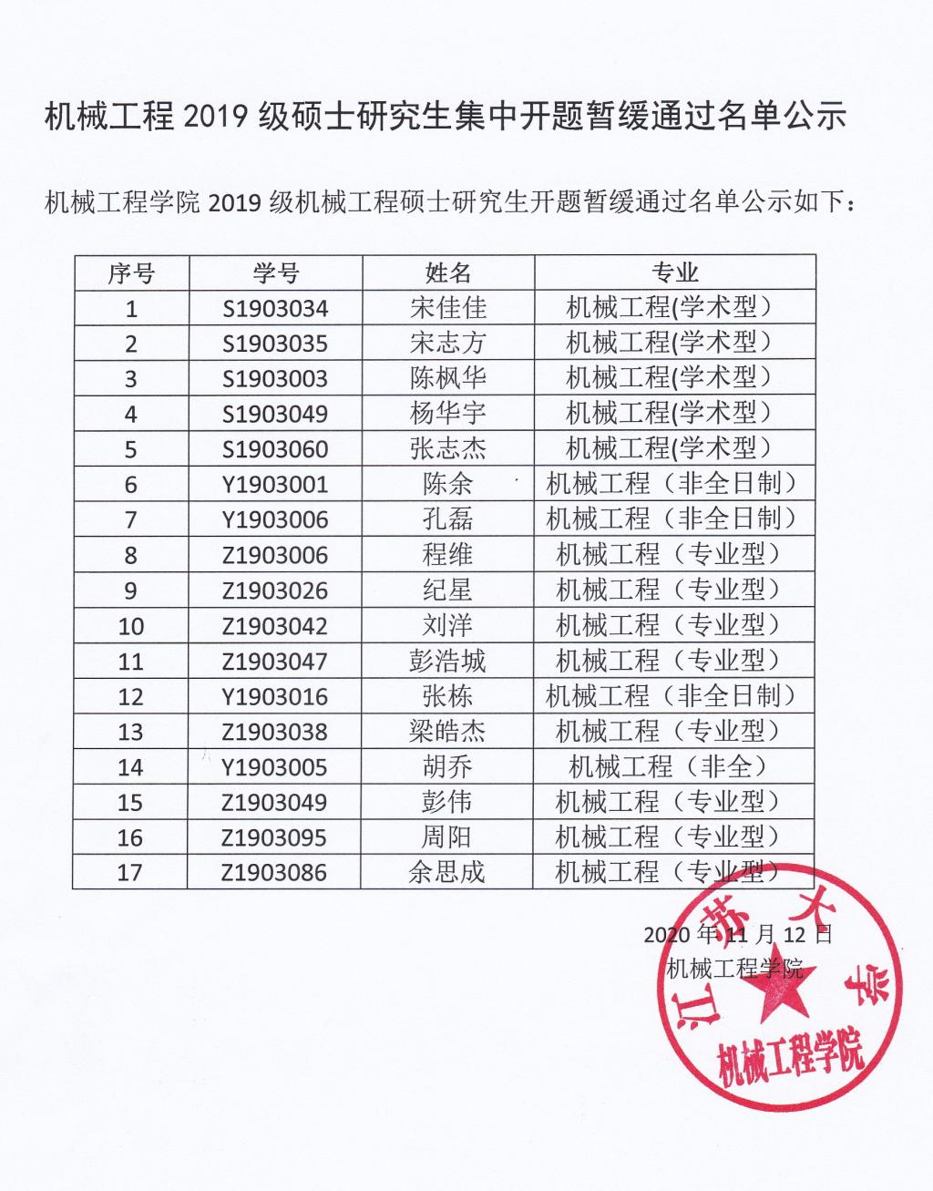 机械工程2019级硕士研究生集中开题暂缓通过名单公示