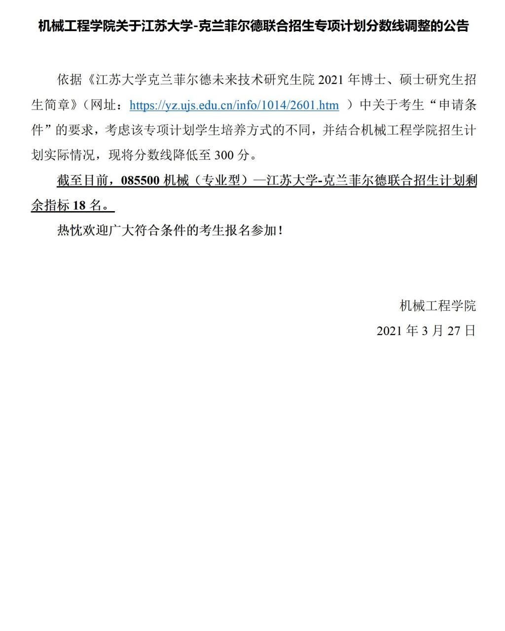机械学院关于德赢Vwin官方区域合作伙伴-克兰菲尔德联合招生专项计划分数线调整的公告.docx