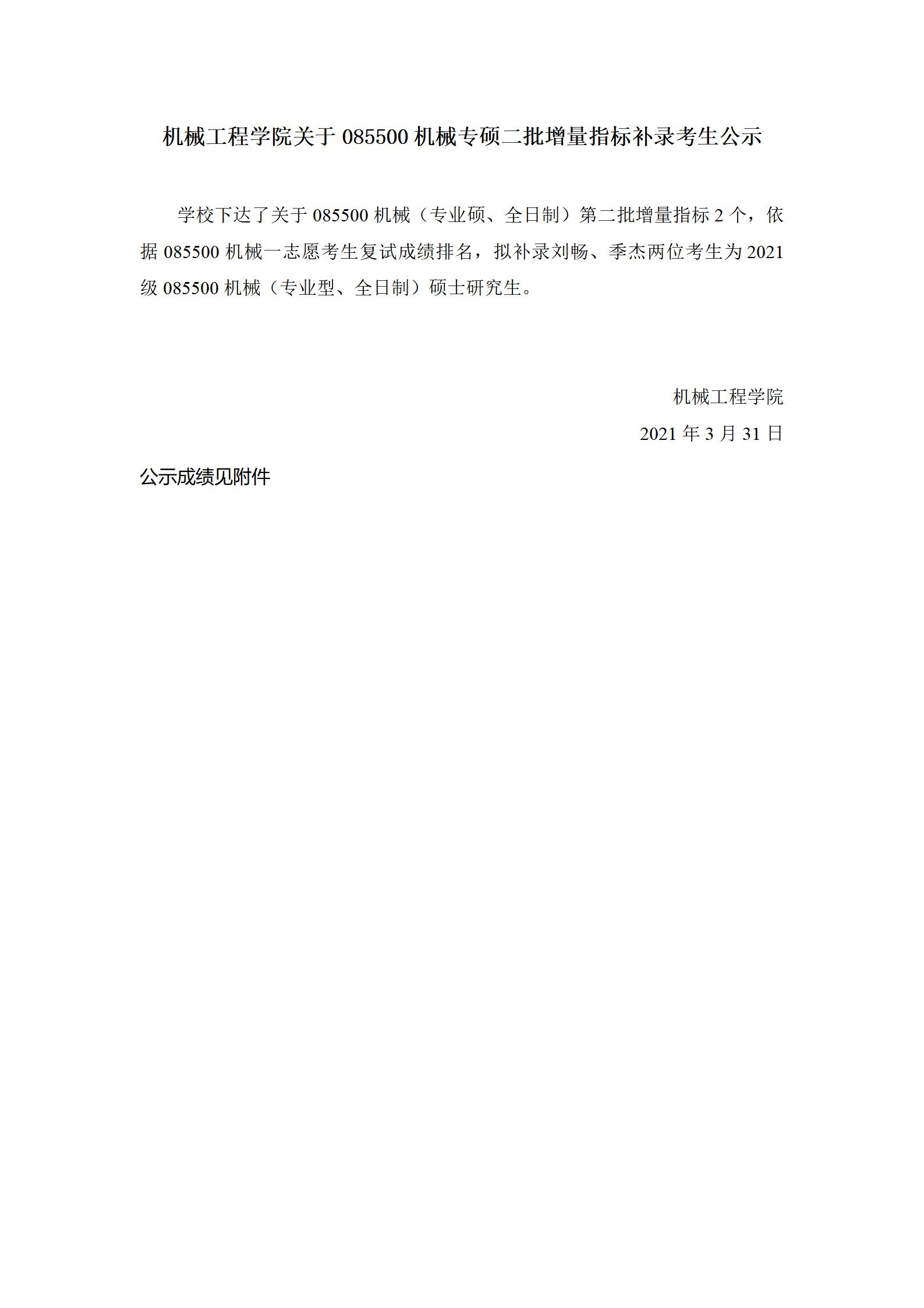 德赢Vwin官方区域合作伙伴关于085500机械专硕二批增量指标补录考生公示-2021年3月31日
