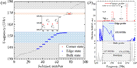 该工作通过交换光子晶体中介质柱和背景的材料实现了拓扑相变和能带反转,为实现高阶拓扑光子绝缘体提供了一种新思路。利用拓扑平庸和非平庸光子晶体设计两种盒型组合结构,在组合结构的边界和拐角分别观测到拓扑边界态和角态,进一步揭示了角态的形成机制,分析了角态对结构缺陷的鲁棒性。该工作为拓扑光学研究提供了新平台,并将对光学集成器件的设计及其在光通信方面的应用具有重要指导意义。
