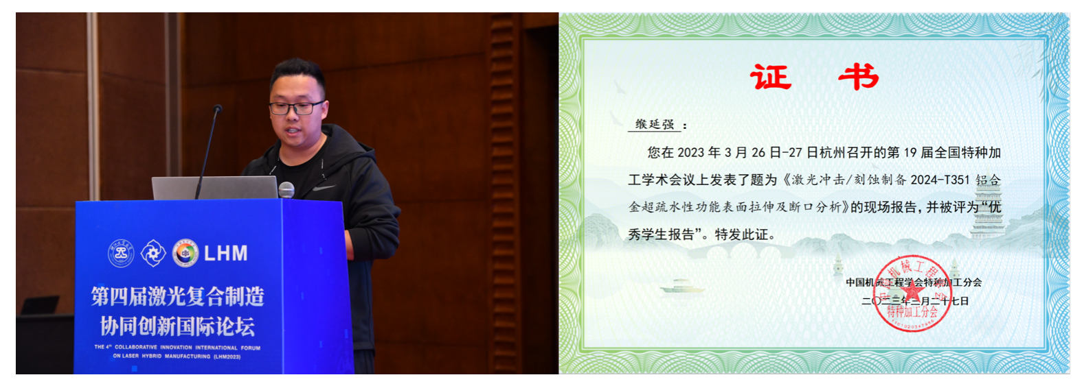 在激光复合制造协同创新论坛上,徐坤副教授作了“激光诱导电沉积制备超薄定域金镀层工艺”的主题报告,获得了同行的一致好评。周建忠教授博士研究生缑延强所作的分组交流报告“激光冲击/刻蚀制备2024-T351铝合金超疏水性功能表面”,从理论、数值模拟及试验应用等几方面系统介绍了课题组在航空铝合金超疏水表面制备,基体材料强化等方面的研究进展,引起了与会代表的高度关注,并被评为本次会议的优秀学生报告。