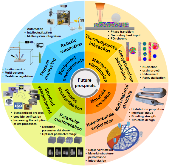 该技术通过利用外部能量场或层间塑性变形方法,在金属增材制造过程中有引导性地调控熔池熔化、流动和凝固行为,或改变固化层晶粒成核、长大及再结晶过程,进而实现微观结构调控及机械性能强化。本论文全面梳理了基于性能控制的复合增材制造技术在残余应力拉-压转换、冶金缺陷闭合、微观结构调控、力学性能改善和各向异性优化的原理,总结了熔池-能量场耦合及热-力交互过程中晶粒形核、生长、再结晶过程。最后,对复合增材制造技术在多能场制造、新材料开发、装备自动化和加工标准制定等方面面临的挑战和发展趋势进行了分析和展望。复合增材制造技术为极端服役环境下复杂精细构件高性能、高寿命、以及高可靠性一体化制造提供了一种全新的途径。