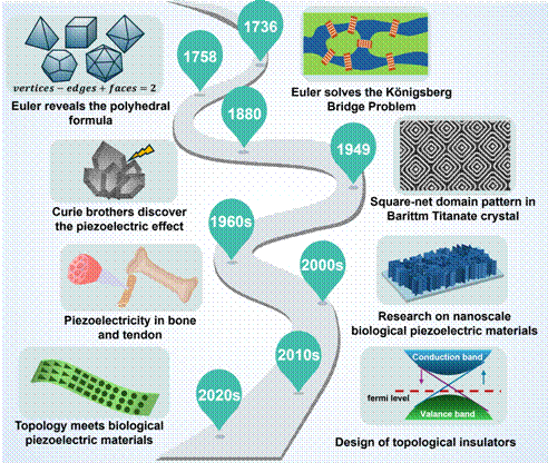 图1. 拓扑结构与生物压电材料的关键里程碑