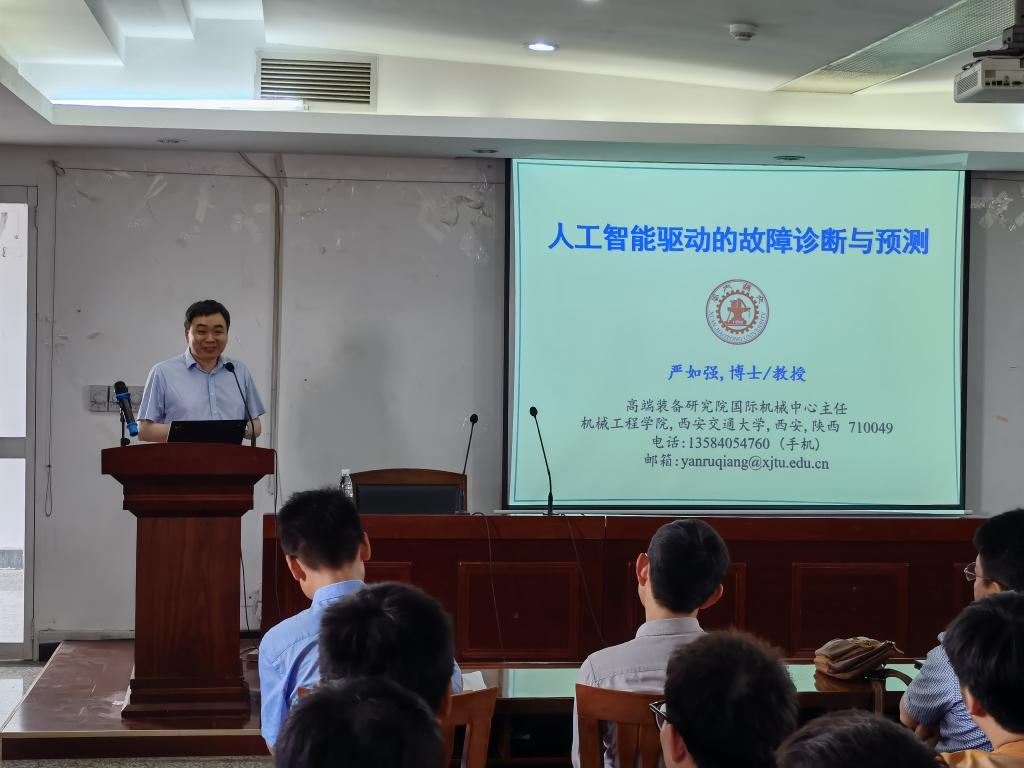 严如强教授的报告首先阐述了机电系统故障诊断与预测的研究意义,阐明了该领域的关键科学问题,并在介绍人工神经网络发展历史的基础上,引出深度学习的概念及特征,随后详细介绍了几种典型的深度网络模型在特征挖掘、知识学习与智能诊断等方面的相关研究成果,并在现有研究基础之上,介绍了课题组最新构造的小波核深度网络模型及其在机电系统诊断与预测中的应用研究成果。报告会后,严教授对师生提出的问题做出了详细解答,并针对报告中的内容与师生展开了深入的探讨,使在场师生受益匪浅。