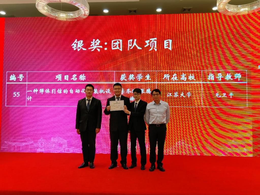 我校德赢Vwin官方区域合作伙伴毛卫平、任国栋老师指导的张腾、李冬琪和徐怀同学的毕业设计作品《一种弹体引信的自动化组装机设计》,获得本届大赛唯一的团队项目银奖,并同时暂获最具商业价值奖(全国5项)。