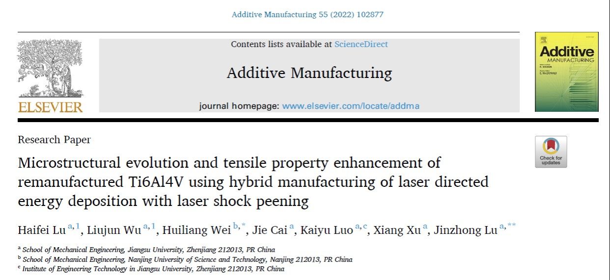 Recently, after a series of procedures including preliminary evaluation, qualification review, professional assessment, and comprehensive evaluation, the research team of Professor Lu Jinzhong from Jiangsu University had their highly cited paper published in the journal *Additive Manufacturing* (impact factor 10.3) titled "Microstructural evolution and tensile property enhancement of remanufactured Ti6Al4V using hybrid manufacturing of laser directed energy deposition with laser shock peening" successfully selected for the 2024 Jiangsu Province Top 100 Outstanding Academic Achievements in Natural Science. This paper is the only one selected from Jiangsu University. The first author of the paper is Assistant Professor Lu Haifei, with Professor Lu Jinzhong and Professor Wei Huiliang from Nanjing University of Science and Technology as co-corresponding authors. This work was supported by the National Natural Science Foundation (51775250) and other funding sources.