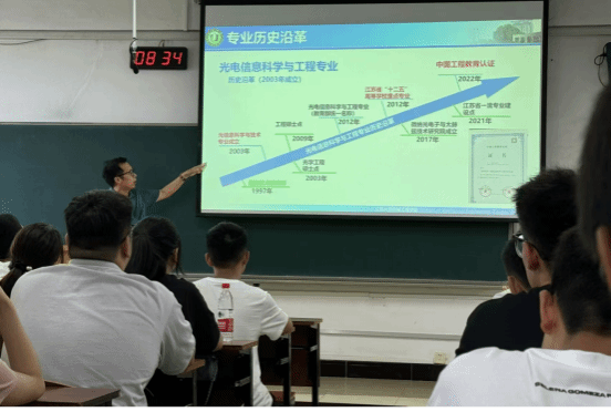 In the classroom full of hope and novelty, Teacher Chen Mingyang explained the development history, professional certification, knowledge characteristics, professional style, and employment prospects of the major to 96 new students. He also introduced the excellent teachers present and several outstanding alumni. The professional vocabulary and Teacher Chen's kind and genial voice greatly stimulated the new students' curiosity about the optoelectronic information major, igniting their enthusiasm for learning the professional knowledge of this field, and filling every student in the audience with anticipation for the future. "The full name of the optoelectronic major is Optoelectronic Information Science and Engineering, which includes both basic scientific knowledge and practical engineering applications." Teacher Chen Mingyang said, "The characteristic of this discipline is that it involves a wide range of subjects, including many elements from other majors." However, the students listening were not discouraged by this and promised to adhere to the professional style of "steadfastness, inheritance, and innovation" in optoelectronic information, striving to improve themselves at Jiangda and bring honor to the country. Their courage to face difficulties and their aspiration to improve might be the most attractive qualities of this year's new students.