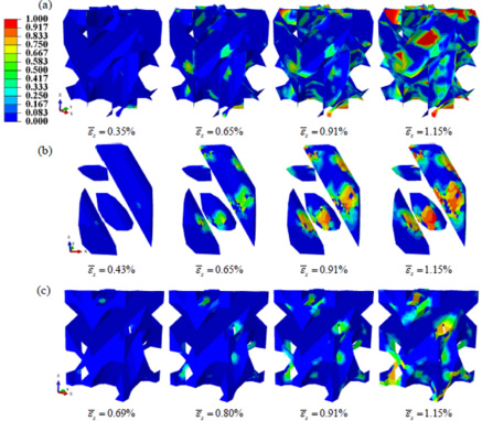 Fig. 4 Damage evolution process of unit-cell of 3D braided composites under different axial strains (a) Interface debonding (b) Yarn LT tensile shear failure (c) Matrix cracking