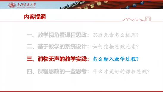 郭为忠教授以“春风化雨、润物无声,课程思政的融入式教学设计”为主题,精彩地讲解了如何在课程教学中融思政教育。“师也者,教之以事而喻诸德者也”,教书与育人天然地就是教育的一体两面、不可分割,新时代强调课程,思政育人是对人的教育的理性回归。课程思政育人贵在春风化雨、润物无声,是在专业文化、知识、技能和能力的传承的同时引领受教育者专业品格、专业素养、人格魅力和家国情怀的激发与养成。