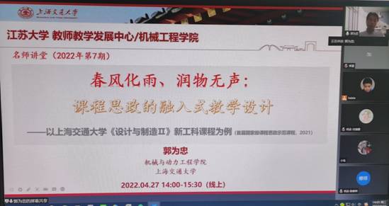 本次讲座郭为忠教授结合《设计与制造II》新工科课程的教学设计与实践经验,从课程教学具体实施的视角出发,讲解了课程思政的基本原则、路径设计和教学实施的系统化思考方法。最后提出了几点思考,什么才是好的课程思政引导教师们进行交流,进行了热烈的探讨。